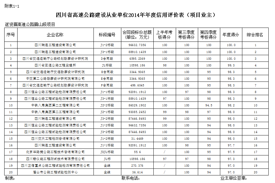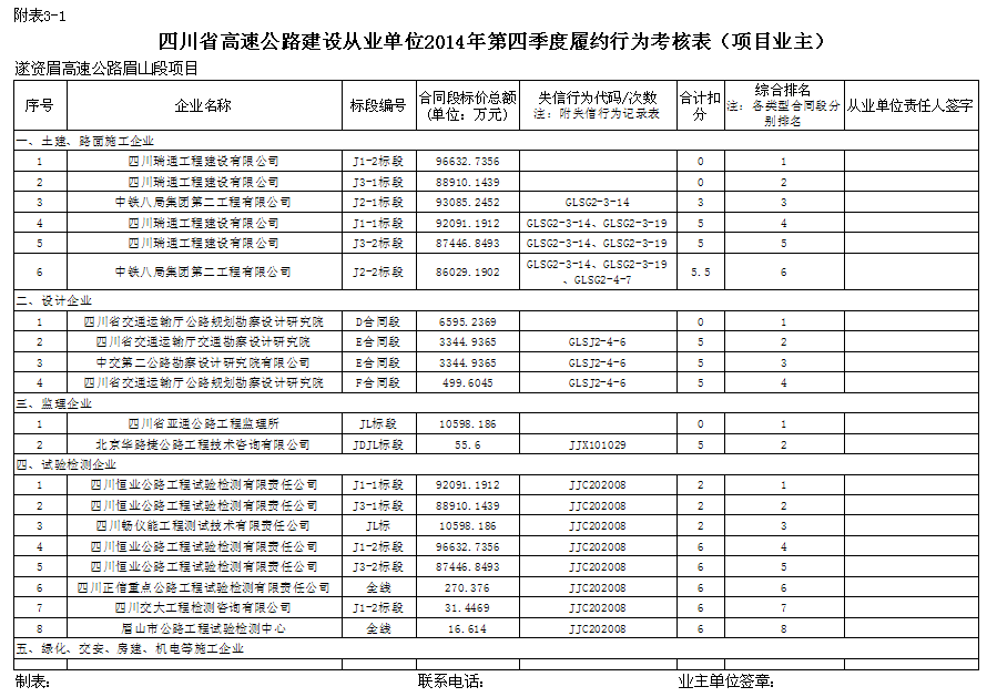 附件1:四川省高速公路建设从业单位2014年第四季度履约行为考核表(附表3-1)